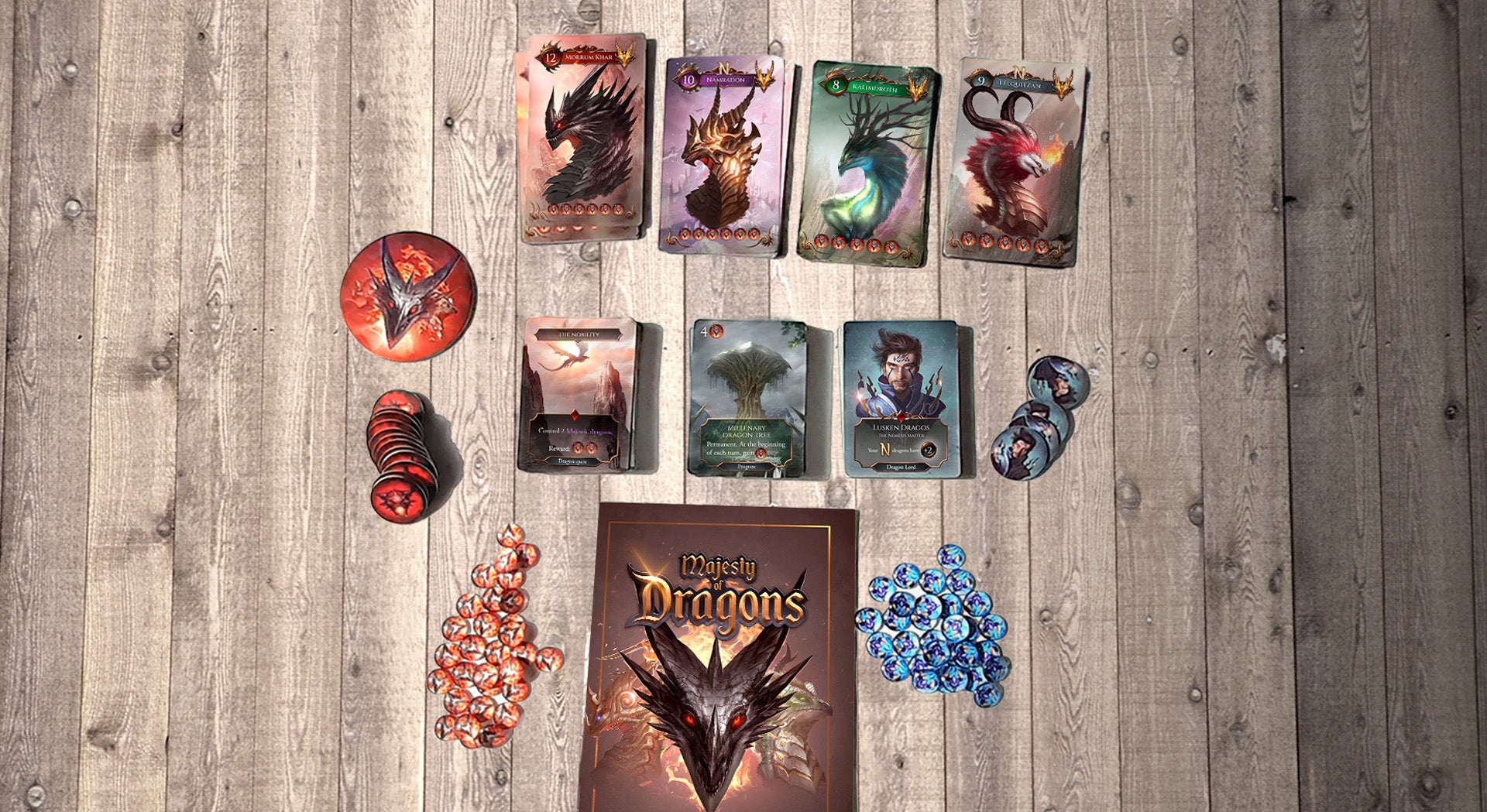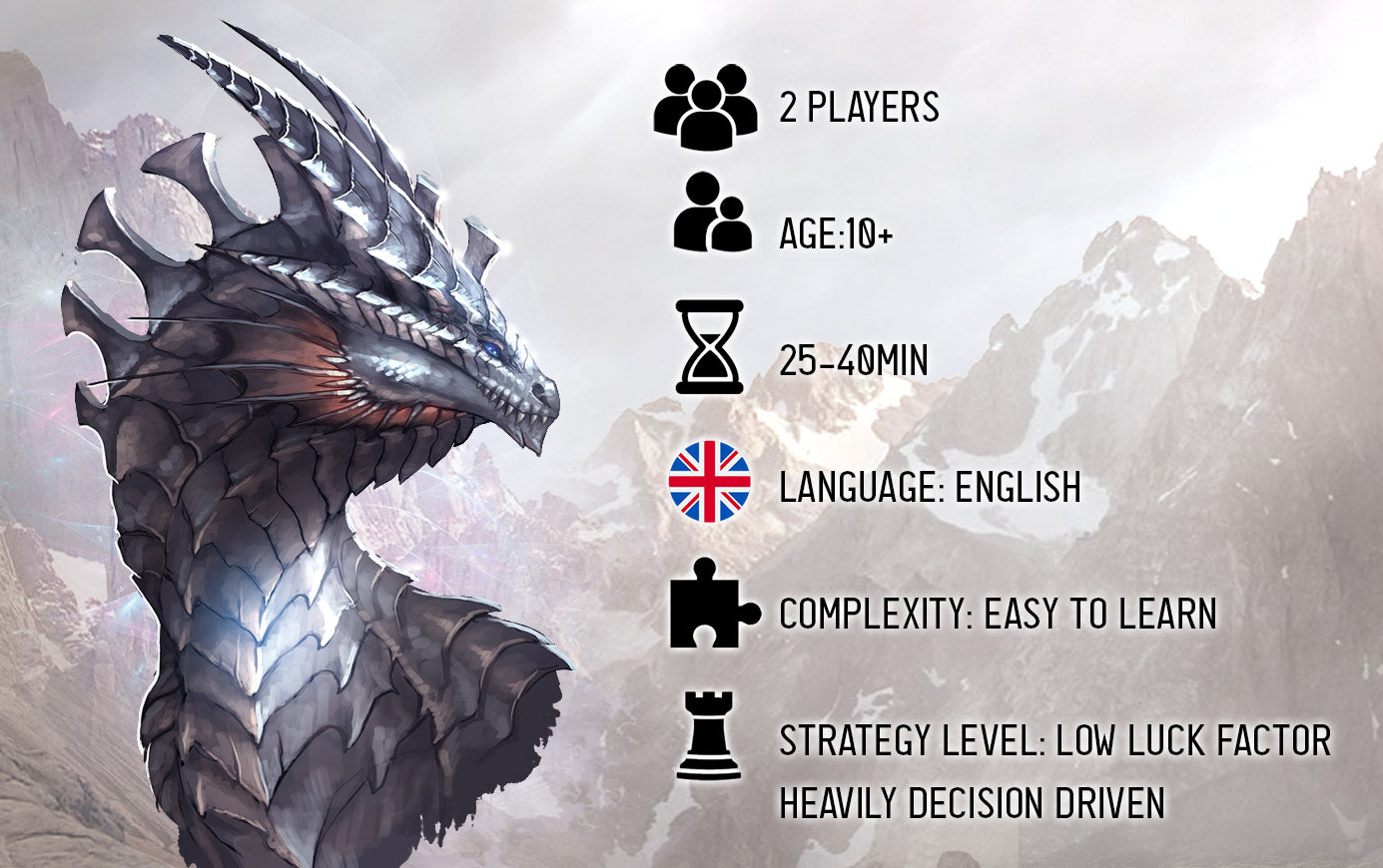 This is a 2 player 25-40min duel game, auction based. Both players start at the same level and conditions. Build and army of dragons and achieve one of the 5 different victory conditions.